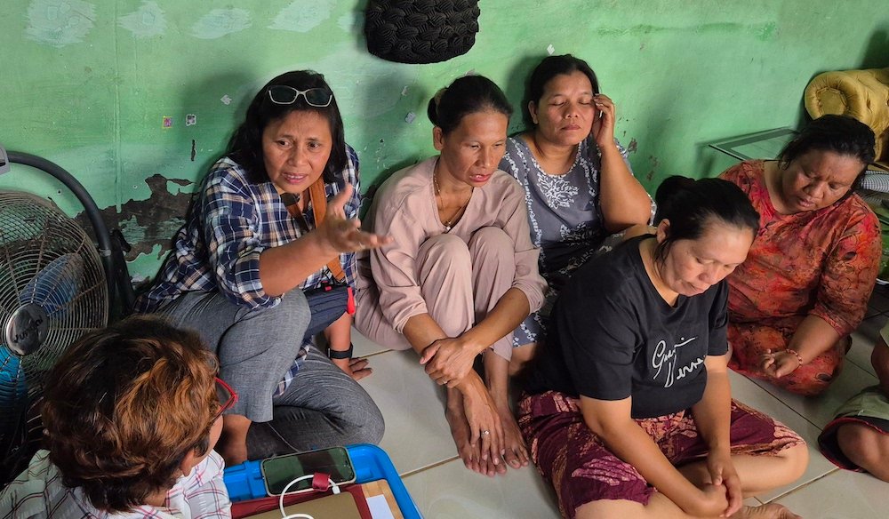 Direktur Yayasan Srikandi Lestari Sumiati Surbakti berdialog dengan warga di sekitar PLTU Labuhan Angin, Sibolga.