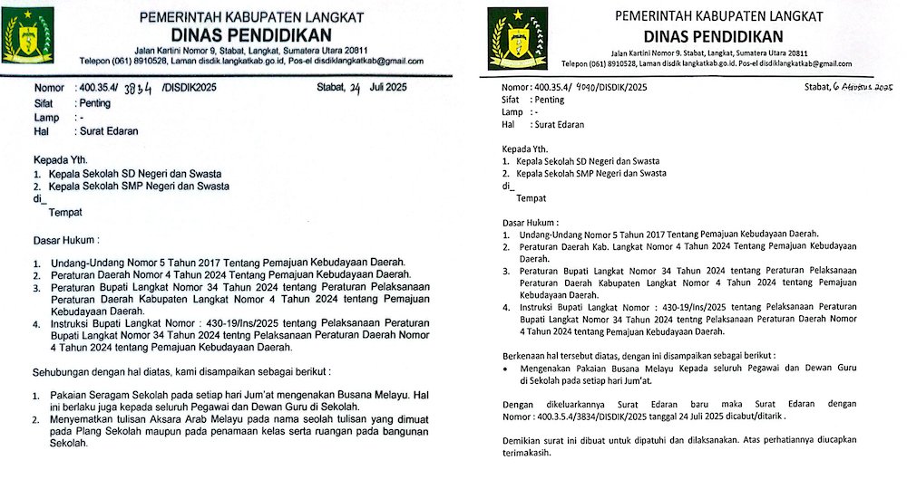 Ungkapan itu, bukanlah bentuk penolakan warga untuk menumbuhkan nilai-nilai budaya di lingkungan sekolah. Namun, Surat Edaran (SE) Disdik Langkat Nomor 400.35.4/3834/DISDIK/2025 terkait kebijakan tersebut, dinilai masih kurang bijak.