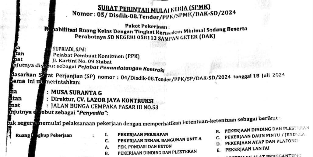 Hal itu sesuai dengan Surat Perintah Mulai Kerja (SPMK) Nomor : 05/Disdik.08.Tender/PPK/SPMK/DAK-SD/2024, yang ditandatangani Supriadi sebagai Pejabat Pembuat Komitmen (PPK) Disdik Langkat.